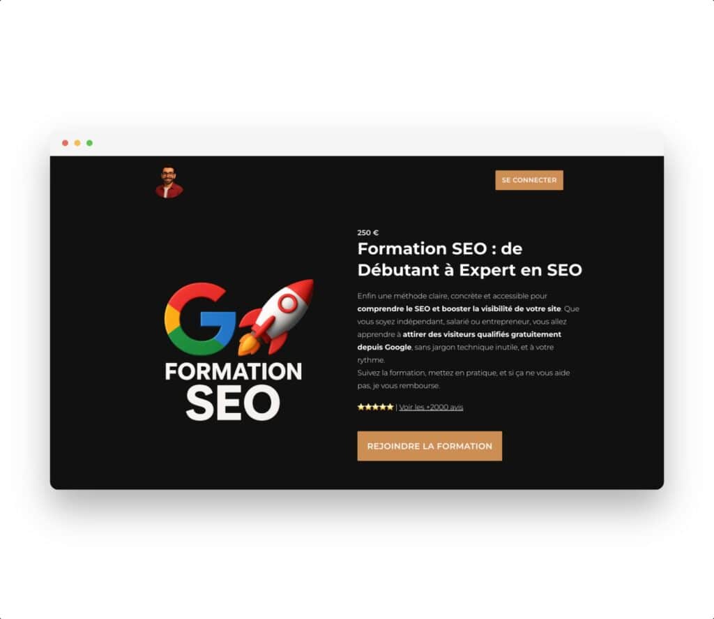 Dans l’article vous explique comment choisir la formation SEO qui correspond vraiment à VOS besoins et ça … c’est spécifique à chacun(e) ! Maintenant pour aller plus vite, dans l’article, vous trouverez pas mal de formations assez complètes mais chères. Certaines sont finançables CPF et OPCO mais souvent vous payez plus cette « prise en charge » que le contenu … Pour gagner du temps je vous conseille donc de commencer par la documentation officielle de Google (gratuite) et ma formation SEO complète : +9h de formation à moins de 300€ avec plus de 5000 personnes ayants été satisfaites … ça en fait la valeur sûre pour commencer et ça suffira pour 99% des personnes ! -50% avec le code LANCEMENT.